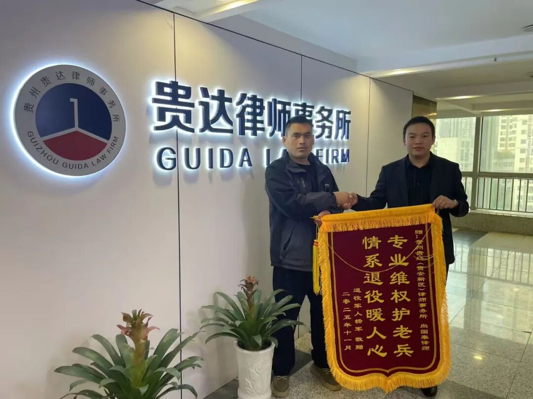 一面红底金字的锦旗,11月初送到了贵州贵达(贵安新区)律师事务所。“情系退役军人暖人心,专业维权护老兵”——落款杨某的这面锦旗,指向的是一起退役军人涉法困境的化解,也是贵阳市退役军人律师工作委员会(以下简称兵工委)成立半年来服务实效的见证。