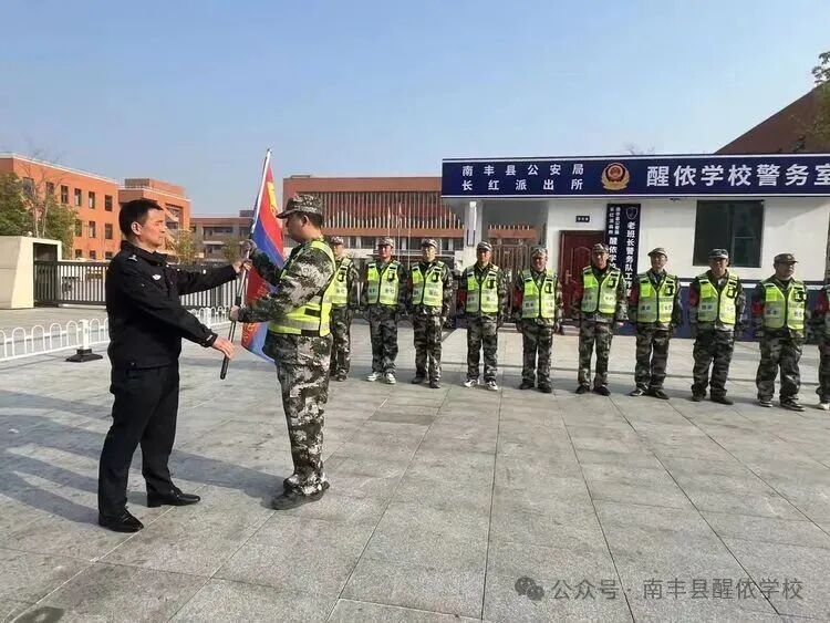 2025年12月18日上午,南丰县醒侬学校“老班长警务室”成立暨授旗仪式隆重举行。县公安局党委副书记、政委郑礼昌同志亲自授旗,将一面印着“老班长警务室”金色大字的旗帜,庄重交到退役军人代表、警务室负责人吴伟班长手中。