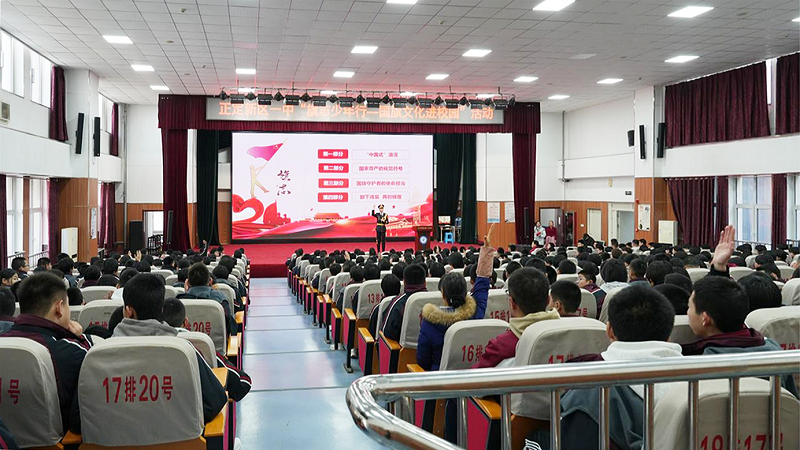 随后,全体学生前往报告厅,参加“国旗文化进校园”专题讲座。主讲人“旗志少年行”团队成员盛东龙,曾多次参加国家重大护卫任务,他以《旗志心中,旗帜最重》为题,围绕中国式浪漫、国家尊严的视觉符号、国旗守护者的使命担当等方面进行了系统讲解,让同学们对国旗文化有了更加全面、深刻的认识。