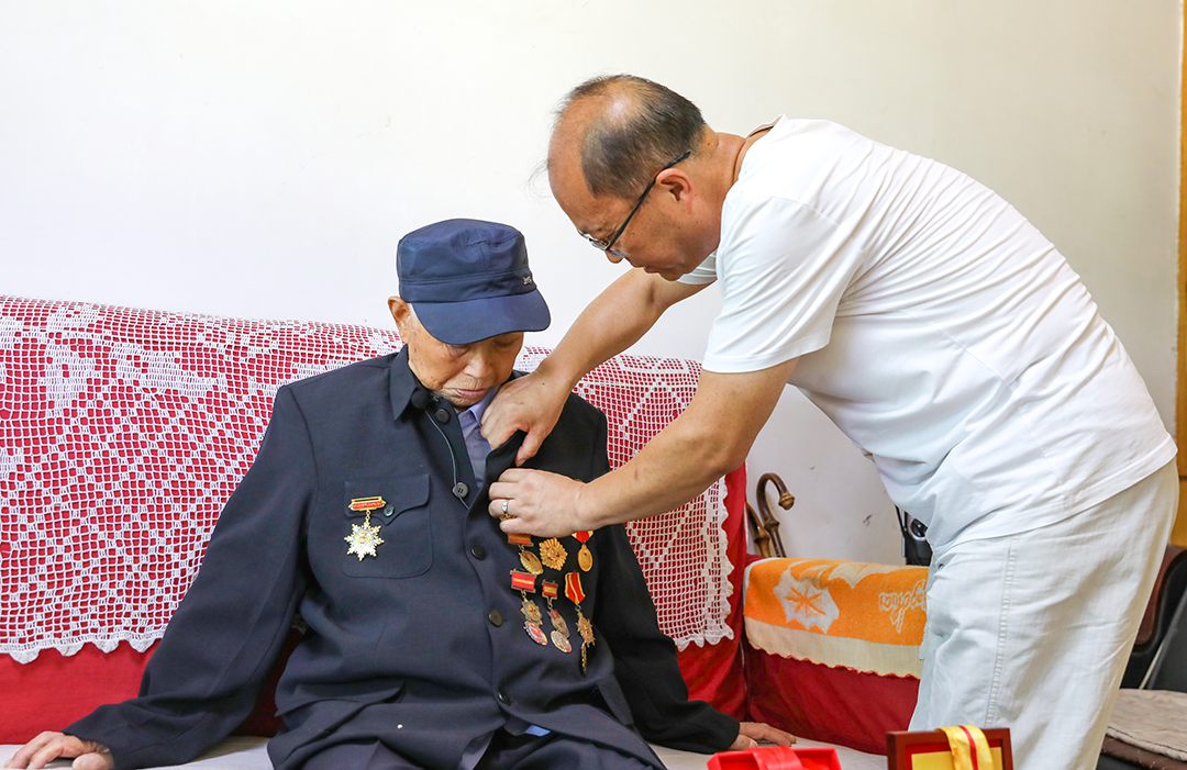 郝敬章的儿子为他整理胸前的勋章