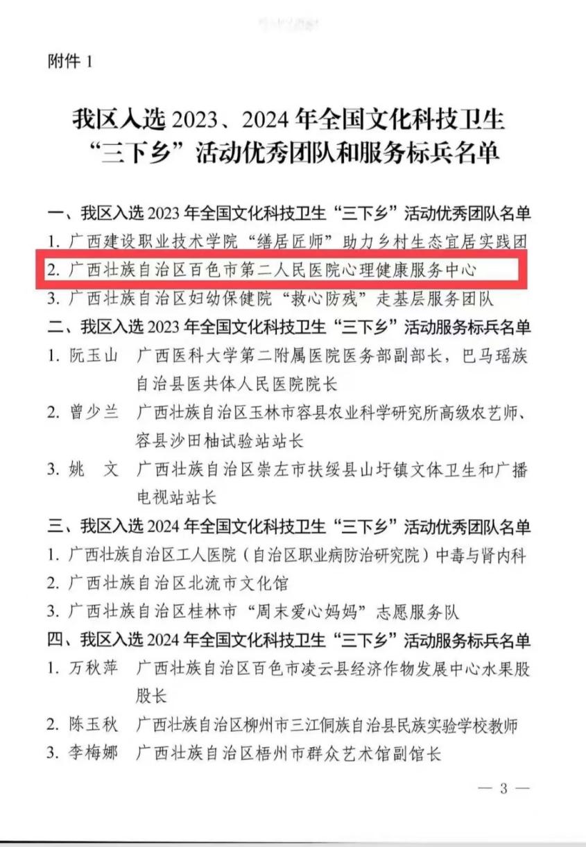 近日,2023-2024年全国文化科技卫生“三下乡”活动优秀团队和服务标兵名单公布,百色市第二人民医院心理健康服务中心凭借扎实的基层服务成效、完善的服务体系建设,成功获评全国“三下乡”活动优秀团队,成为当年度广西获此殊荣的3家单位之一,也是全区精神卫生领域唯一上榜的先进集体,这份荣誉既是对中心工作的高度肯定,更是对百色市心理健康服务事业发展的有力鞭策。
