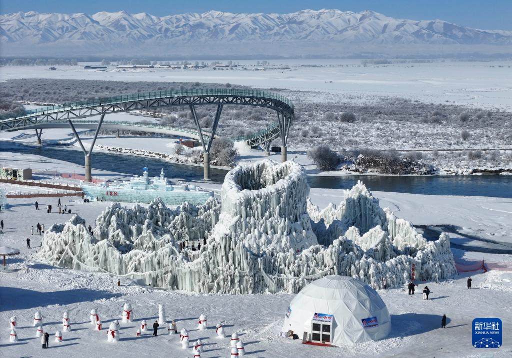 1月3日,游客在新疆昭苏县冰雪乐园游玩(无人机照片)。新华社记者 胡虎虎 摄