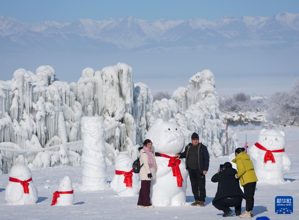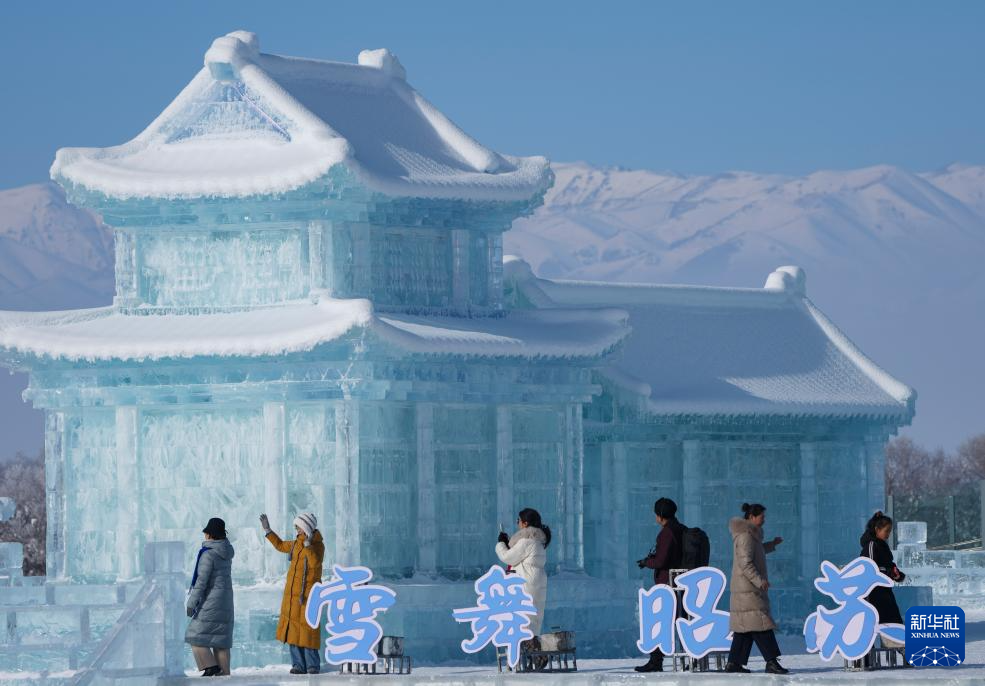 1月3日,游客在新疆昭苏县冰雪乐园参观冰雕作品。新华社记者 胡虎虎 摄