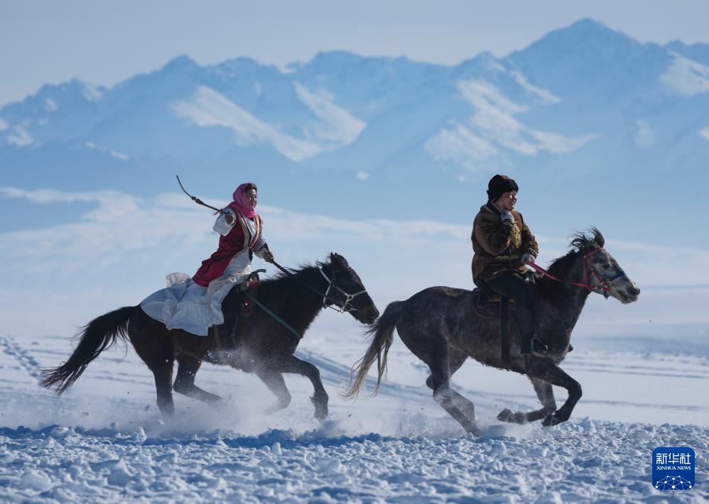 这是1月3日在新疆昭苏湿地公园拍摄的传统民俗“叼羊”表演。新华社记者 徐宏岩 摄