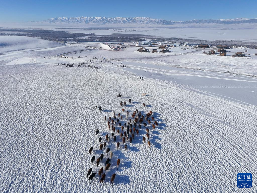 这是1月3日在新疆昭苏湿地公园拍摄的“天马踏雪”表演(无人机照片)。新华社记者 胡虎虎 摄