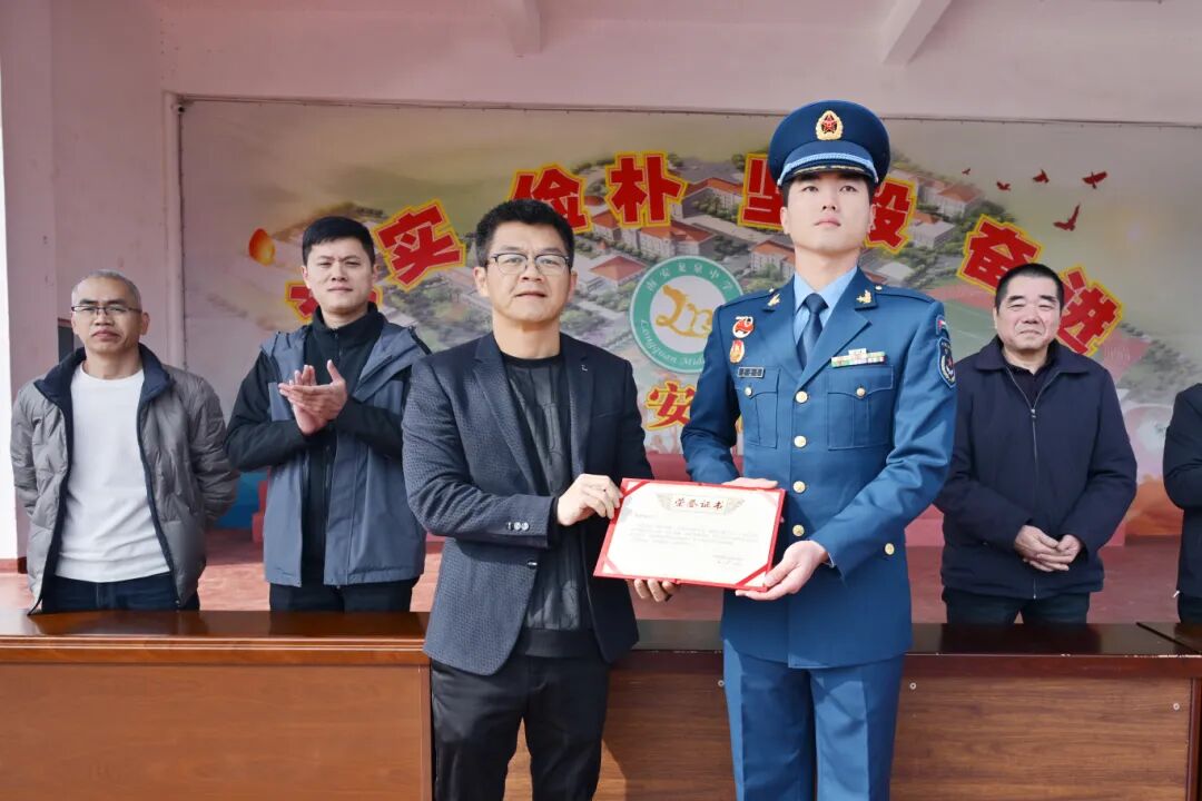 随后,李清新副校长代表学校为李佳发校友颁发荣誉证书。证书之上,不仅是学校对他卓越成就的认可,更凝聚着全体师生对优秀校友的崇敬与自豪。手持证书的李佳发校友与校领导并肩而立,笑容中满是荣光与欣慰,这一刻,校友情、师生情在校园中温情流淌。