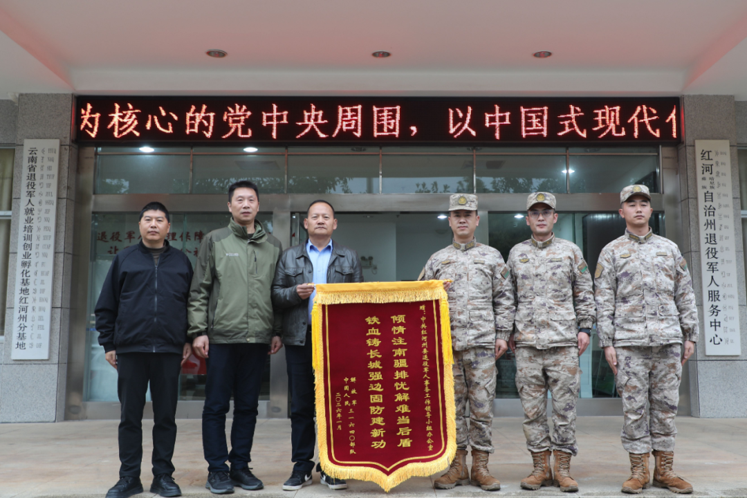 1月6日,31640部队及驻绿春某边防连队相关负责人到州退役军人事务局赠送“倾情注南疆排忧解难当后盾 铁血铸长城强边固防建新功”的锦旗,对州委退役军人事务工作领导小组长期以来关心支持边防一线基层连队建设发展表示诚挚的感谢。