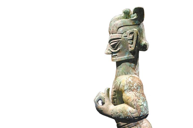 “崇祀天地——精神信仰与祭祀”单元,则展现古蜀先民浪漫的想象力和非凡的创造力。礼敬天地的美玉、纵目千里的面具、人鸟合一的神像等文物,表明宗教祭祀在古蜀国社会生活中具有崇高地位。这些与祭祀有关的古蜀秘宝不仅改写了中国青铜时代的知识图谱,更在神灵、祭祀和偶像崇拜等方面提供了与世界古代文明进行比较互鉴的珍贵样板。