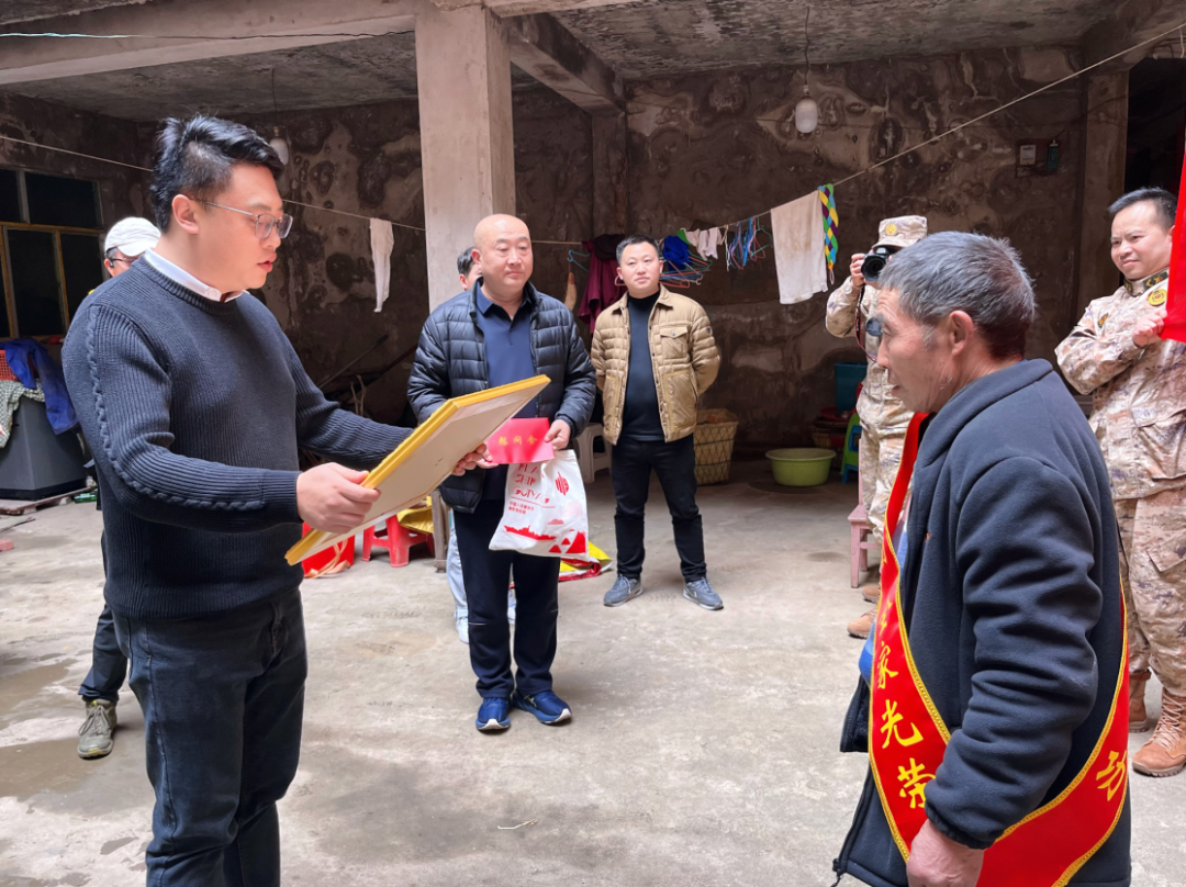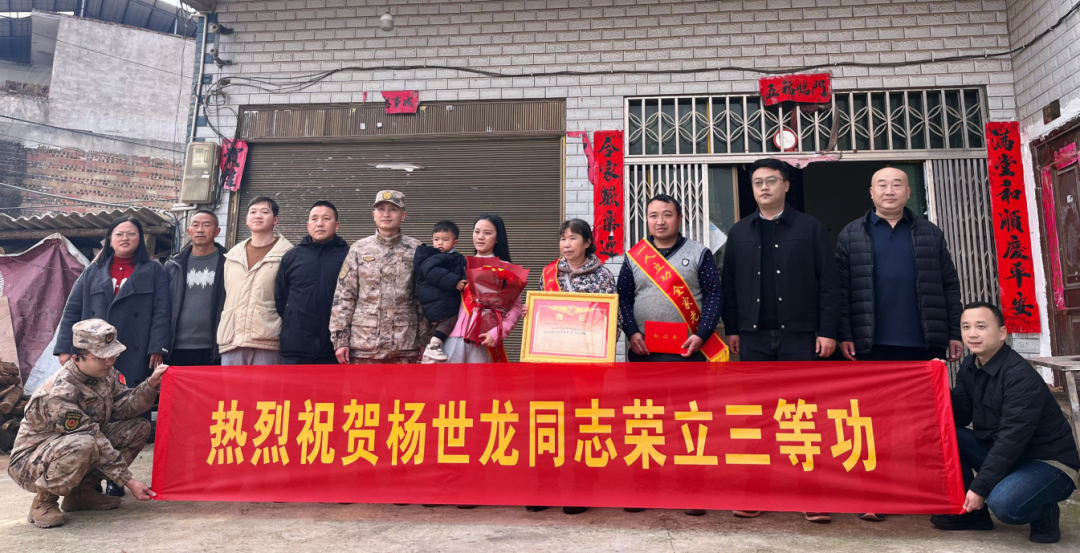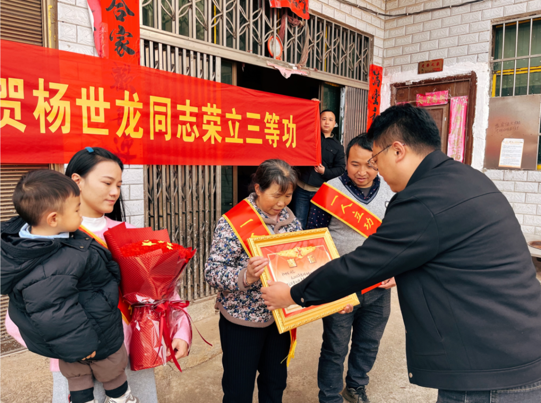 1月19日,贵阳市退役军人事务局、贵安新区社会事业管理局、贵阳市花溪区人民武装部联合组成“报喜团”,赴贵安新区高峰镇王家院村、党武街道翁岗村,为荣立三等功的现役军人杨世龙、沈兵家属送上立功喜报、慰问金及党和政府的关怀,以实际行动弘扬拥军优属光荣传统,营造“一人参军、全家光荣”的社会风尚。