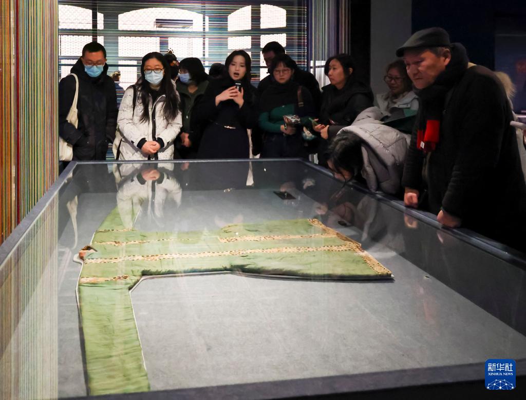 1月20日,观众在展览上观看北宋时期的缂丝饰边绿绢长袍。
