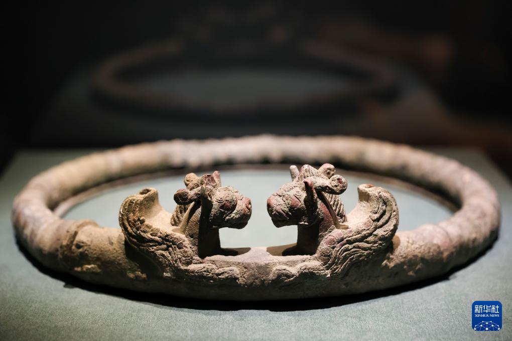 这是1月20日在展览上拍摄的战国时期的翼兽对视铜环。