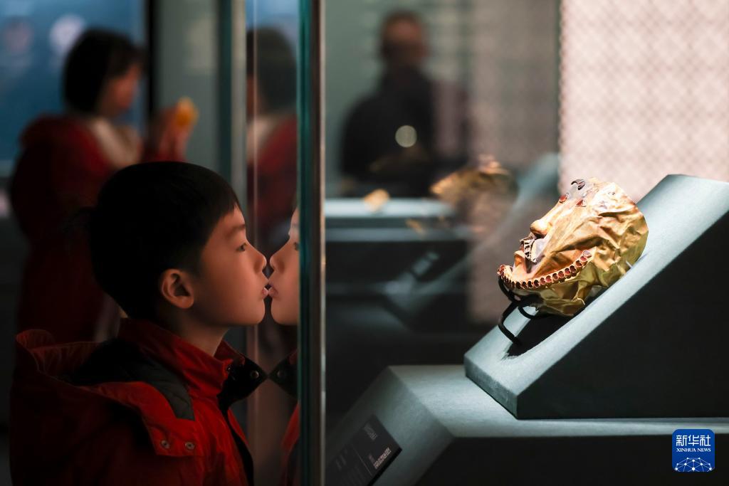 1月20日,观众在公元5至6世纪的镶嵌红宝石金剑鞘展柜前拍照留影。