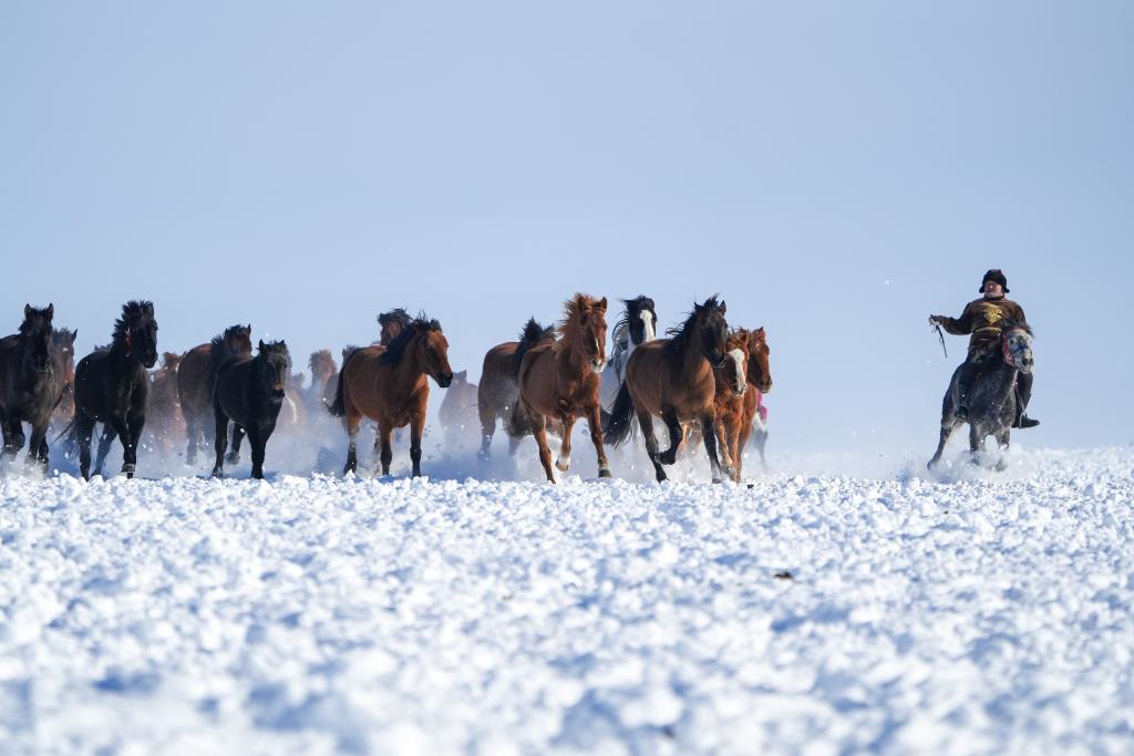 1月3日,新疆昭苏县湿地公园的“天马踏雪”表演。新华社记者 徐宏岩 摄