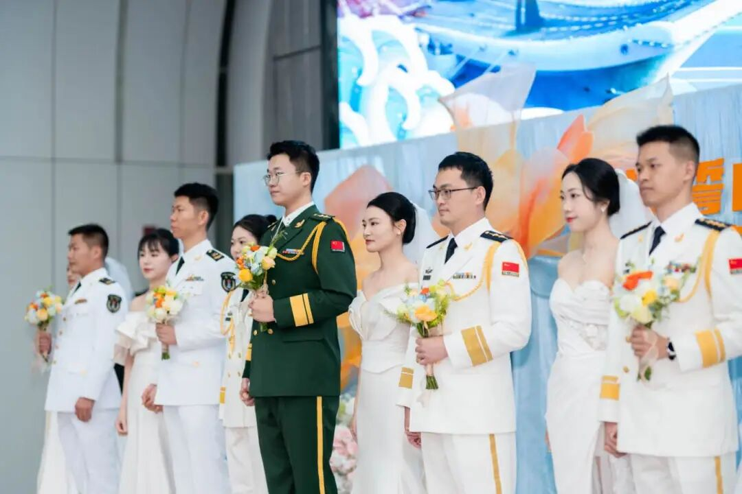 随后,新人代表分享了军旅爱情故事,展现了军人家庭的奉献与坚守。现场新人合唱《爱在南海》,歌声激越,情真意切。活动主办方为新人郑重颁发传统婚书卷轴,更以“同心同箸”幸福餐具礼盒相赠——祝愿他们一餐一饭,相依相伴;一箸一碗,一生温暖。