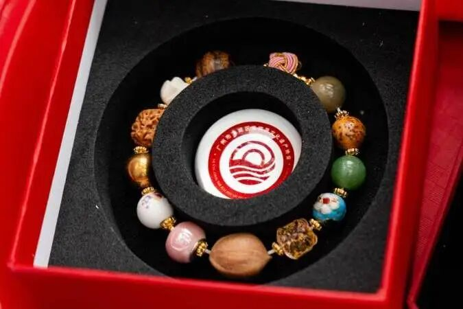 信物赠礼,匠心独运。新郎为新娘佩戴海珠非遗手链:13颗凝结了广绣、榄雕等13种非遗元素的串珠紧密相连,寓意“珠联璧合、一生相伴”的美好期许,让岭南文脉为爱情加持。