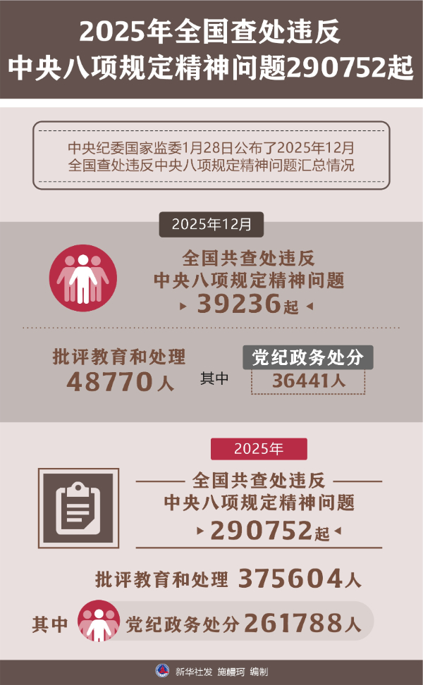 新华社北京1月28日电 中央纪委国家监委28日公布了2025年12月全国查处违反中央八项规定精神问题汇总情况。当月,全国共查处违反中央八项规定精神问题39236起,批评教育和处理48770人,其中党纪政务处分36441人。2025年,全国共查处违反中央八项规定精神问题290752起,批评教育和处理375604人,其中党纪政务处分261788人。