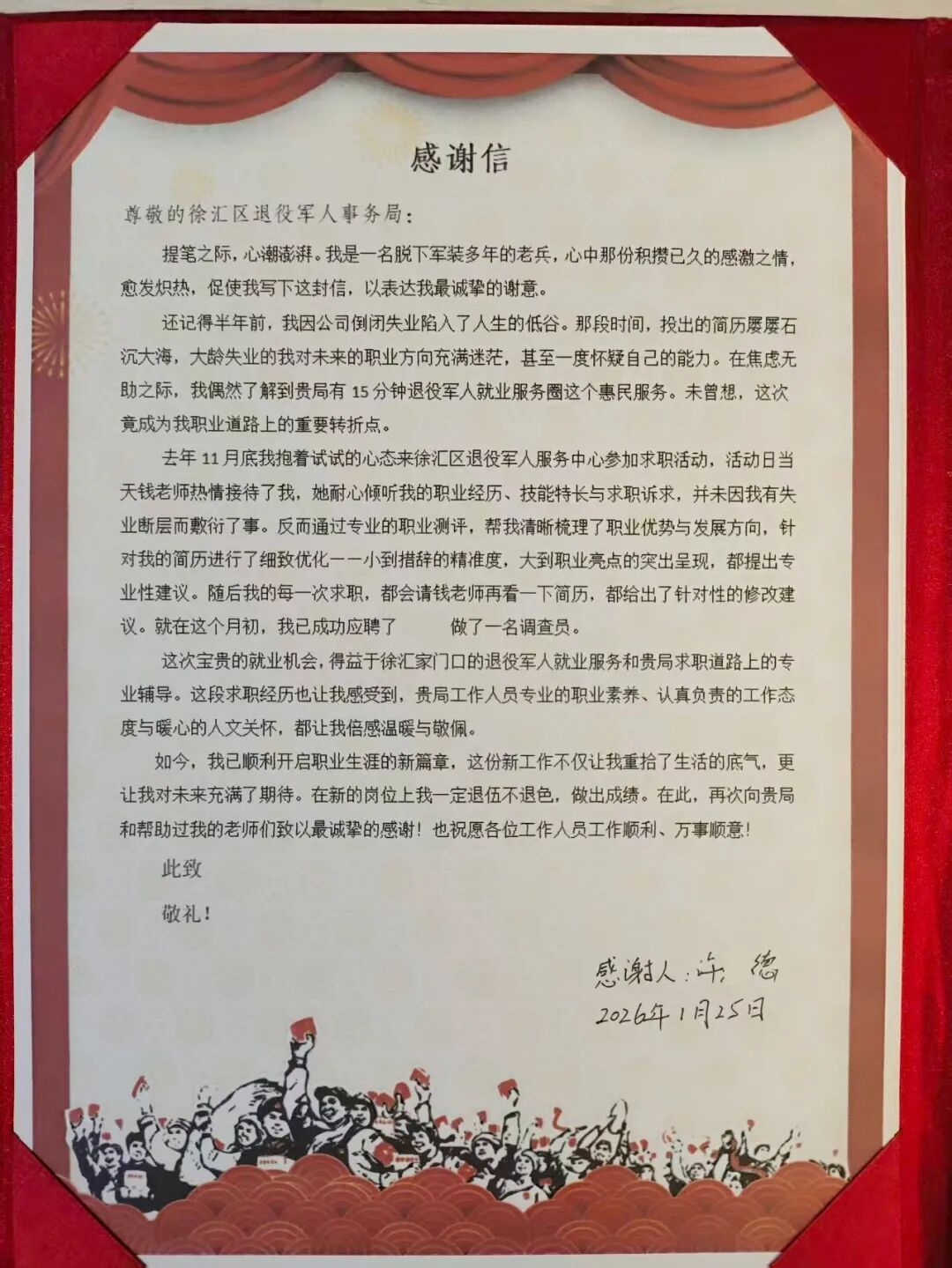 一封退役军人的感谢信,生动彰显了徐汇区15分钟退役军人就业服务圈的实践成效。自2025年10月试运行以来,徐汇区扎实推进15分钟退役军人就业服务圈建设,做到日日有服务、月月有活动。