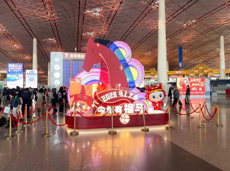 现在,走进首都机场航站楼,精心设置的新春景观让节日氛围扑面而来。其中,3号航站楼以“天马”主题呼应汉代“天马为龙使”的文化内涵,象征连接世界;2号航站楼塑造“日历新篇”景观,融入剪纸风格马年图案与北京剪影,寓意新年启程、时光焕新。首都机场还在车道边、值机区等区域张贴了马年主题窗花与装饰贴纸,向过往旅客传递温馨的新年问候。