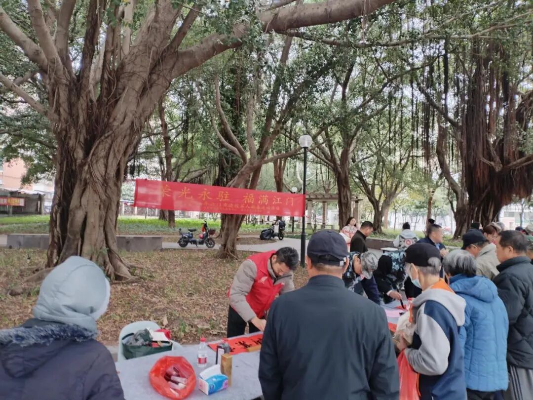 近日,江门市退役军人服务中心旁公园墨香弥漫、暖意融融,由江门市退役军人事务局指导,江门市退役军人服务中心、蓬江区书法家协会主办,蓬江区白沙街道退役军人服务中心与李泉龙律师老班长工作室共同承办的“荣光永驻,福满江门”——2026年新春送祝福公益活动在此温暖举行。活动以笔墨传递祝福,以服务温暖人心,为退役军人及周边市民带来了一个充满文化气息与深情关怀的腊月上午。