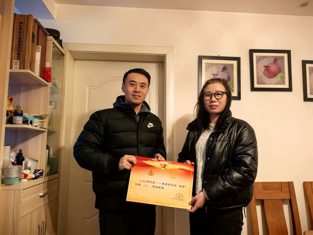 喜报进门,荣光满屋。小组成员双手递上烫金的喜报,向军属表达诚挚的祝贺与敬意。这份喜报,不仅记录着军人在部队的拼搏与成绩,也凝结着军属们长久的支持与付出。小组亲切问候每一户军属,感谢他们默默坚守、无私奉献,为国防事业筑牢了坚实的后方。