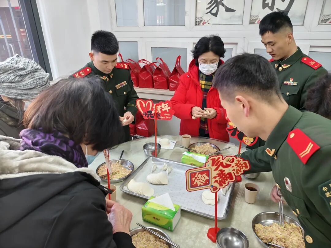 与此同时,在食堂操作区,包饺子活动也热火朝天地进行着。战士们与退役军人、优抚对象围坐在一起,拌馅、擀皮、包捏,动作娴熟,笑语不断。炊事班班长现场分享技巧,大家交流心得,在协作中拉近了彼此距离。新老两代人相逢在这温暖的烟火气里,不谈过往功勋,只叙家国情怀。