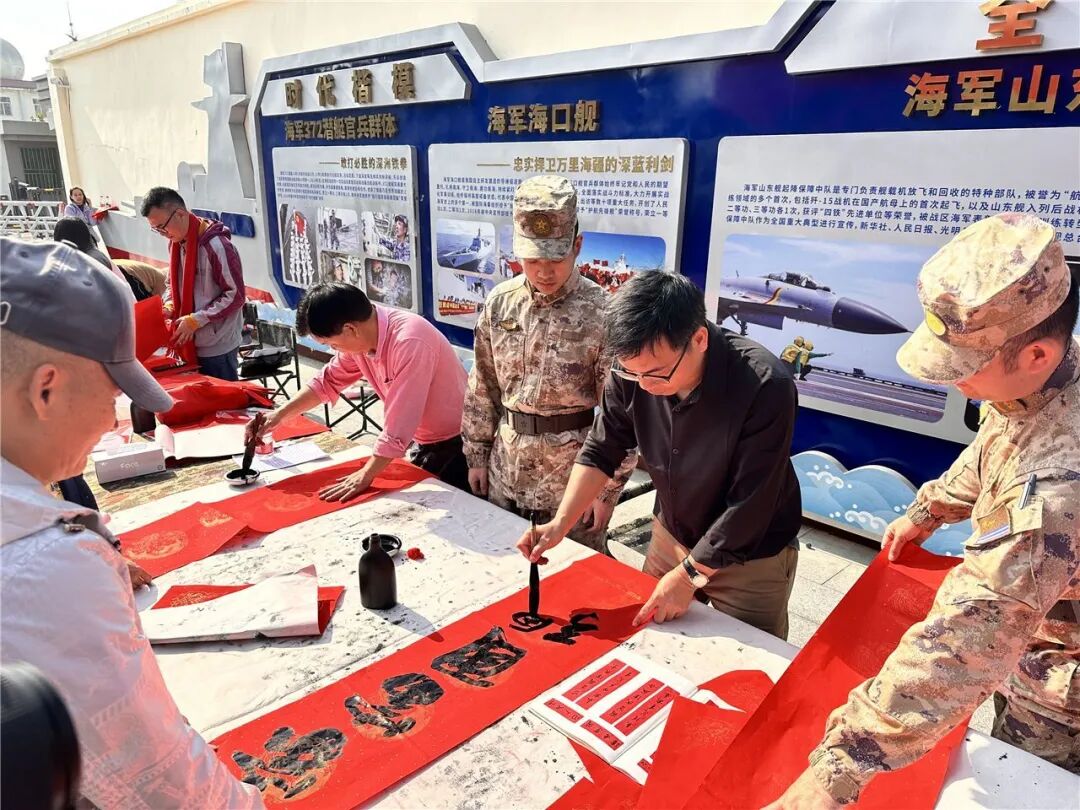 活动现场墨香四溢,年味浓郁。官兵们围绕在案前,热情协助铺纸提纸,与书法家探讨运笔技巧,交流心得。几位军娃也跃跃欲试,在书法家的指导下认真地写下稚嫩却真诚的“福”字。一副副军味十足的对联,一张张浑厚有力的“福”字跃然纸上,凝聚着对军人无私奉献的尊崇敬意,寄托着对国家安宁的美好祝愿。此时此刻,文明北一路不仅是地理通道,更是情感纽带,官兵、家属和书法家们在这条“军民共建标杆路”上交流互动,生动体现新时代军民鱼水情谊。
