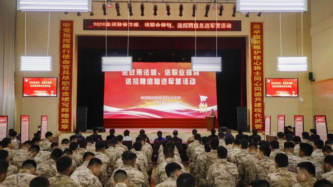 2月26日,宁夏回族自治区退役军人事务厅走进驻宁某部队开展“送政策法规、送职业规划、送招聘信息”进军营活动。部队官兵及家属、用人单位代表,退役军人代表等200余人参加活动。