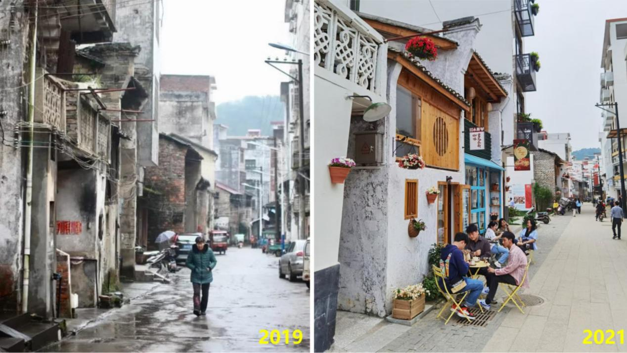 (拼接对比图:2019年、2021年江西永新县老城区街道改造前后。张广汉提供)