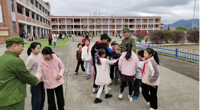 宣讲结束后,操场互动环节温情满满。小学生们争相与老兵们握手、合影,稚嫩的话语、纯真的眼神深深打动了在场的每一位老兵。老兵们依依不舍,殷切勉励孩子们好好学习、练就本领,长大以后报效祖国。当车辆缓缓驶离校园时,学生们依依不舍地挥手道别,一声声“再见,叔叔们”回荡在校园上空,场面温馨而感人。
