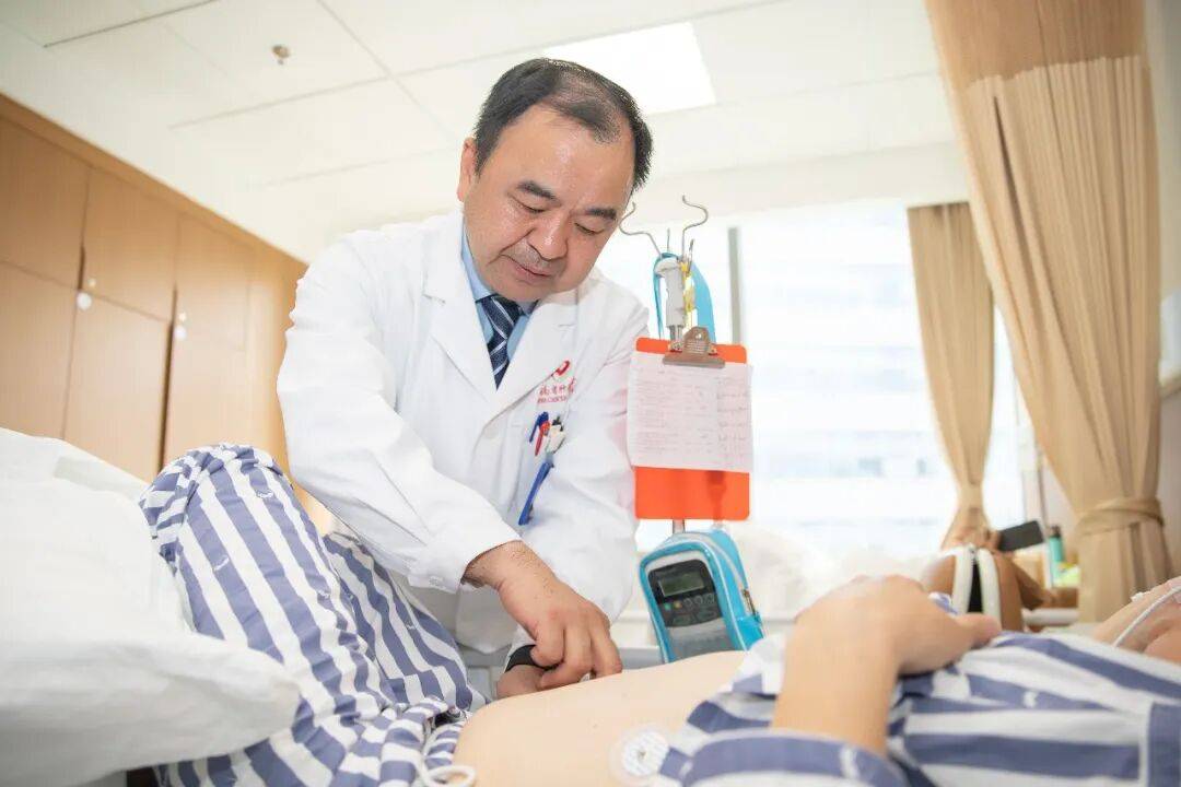 在湖南省肿瘤医院病房,向华为患者检查身体情况。(本人提供)