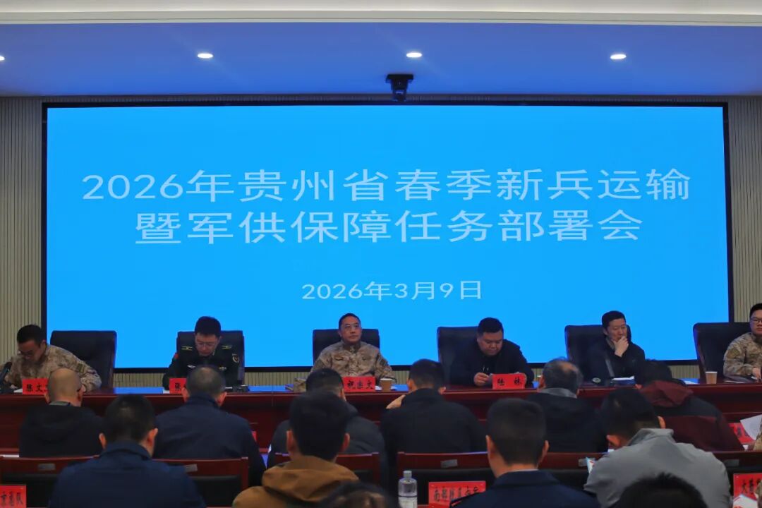 3月9日,2026年贵州省春季新兵运输暨军供保障任务部署会在贵阳召开。军地有关单位共50余人参会,会议通报了2026年春季新兵运输任务总体情况,提出了提高思想站位、严密组织实施、优质服务保障、确保绝对安全四个方面具体要求,明确了运输组织流程,部署了军供保障工作。