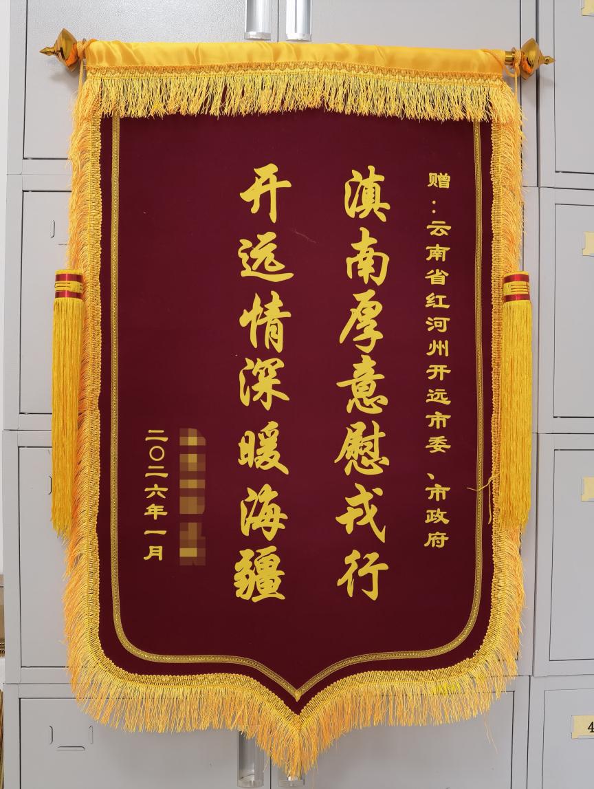 近日,一面承载深情的锦旗从边海防某部跨越山海,送至开远市。锦旗上“滇南厚意慰戎行,开远情深暖海疆”十四字,道出了官兵对开远倾力支持国防、扎实拥军优属的高度肯定和真诚感谢。