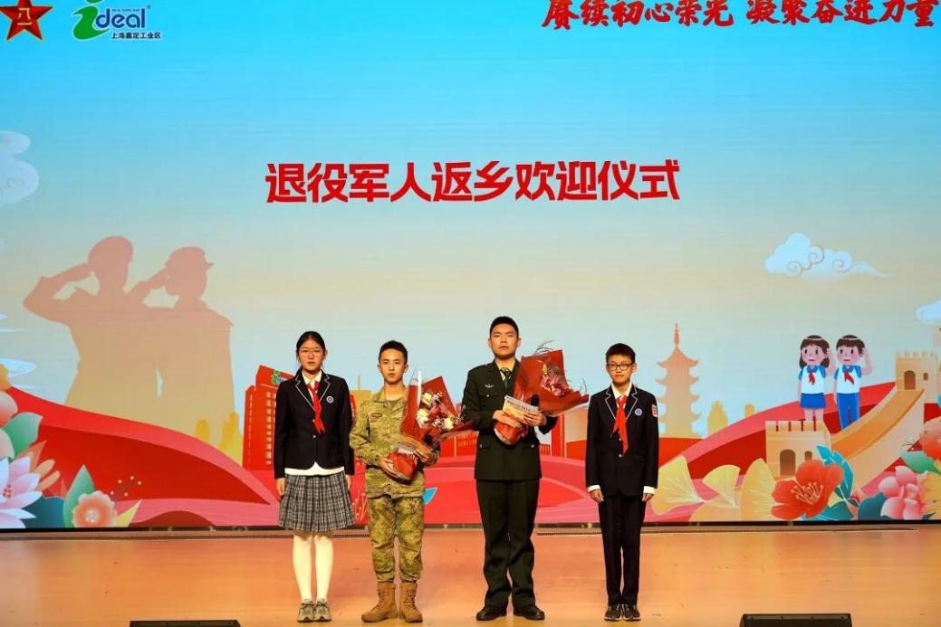 退役军人讲述戎装背后的故事,并举行退役军人返乡欢迎仪式,上海大学附属嘉定实验学校的少先队员们为退役军人献上鲜花。随后,义务兵预征对象代表从老兵手中接过接力棒。