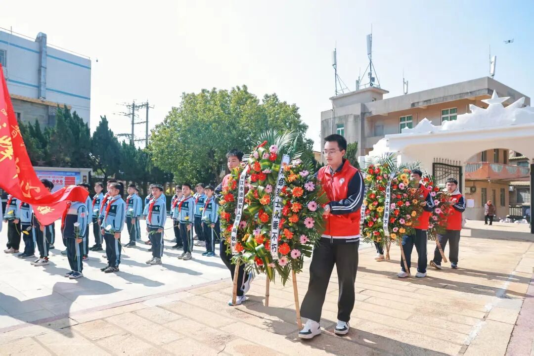 随后,全场人员怀着无比崇敬的心情,向长眠于此的革命先烈默哀,深切追思他们为民族独立、人民解放抛头颅、洒热血的峥嵘岁月。默哀毕,师生代表缓步走向烈士纪念碑,敬献花圈,寄托对英烈的深切哀思。全体人员有序上前,手持鲜花,依次敬献至纪念碑前,朵朵鲜花承载着对先烈的缅怀与敬仰。