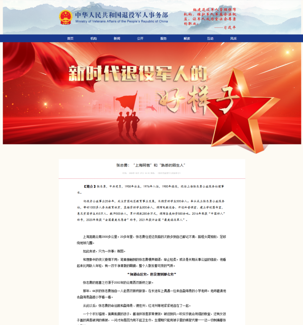 近日,退役军人事务部官网推出新时代退役军人的“好样子” 专栏,集中展现新时代退役军人的精神风貌与责任担当。上海市徐汇区优秀退役军人张志勇同志的先进事迹成功入选该栏目,成为广大退役军人学习的榜样。