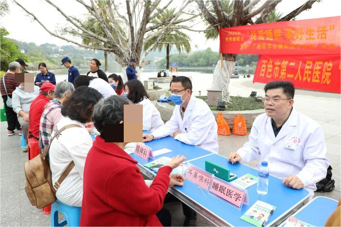 2026年3月21日是世界睡眠日,为弘扬雷锋精神,发挥医疗优势,普及睡眠知识,提升社区群众健康素养,3月20日,百色市第二人民医院联合百城街道文明社区在滨江公园开展“优质睡眠,美好生活”主题健康义诊暨学雷锋志愿服务活动,把健康服务送到群众家门口。