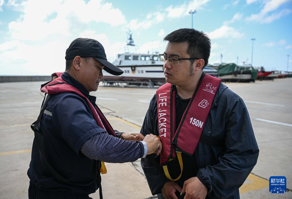 3月19日,海上交通保障船工作人员(左)协助乘客穿戴救生衣。