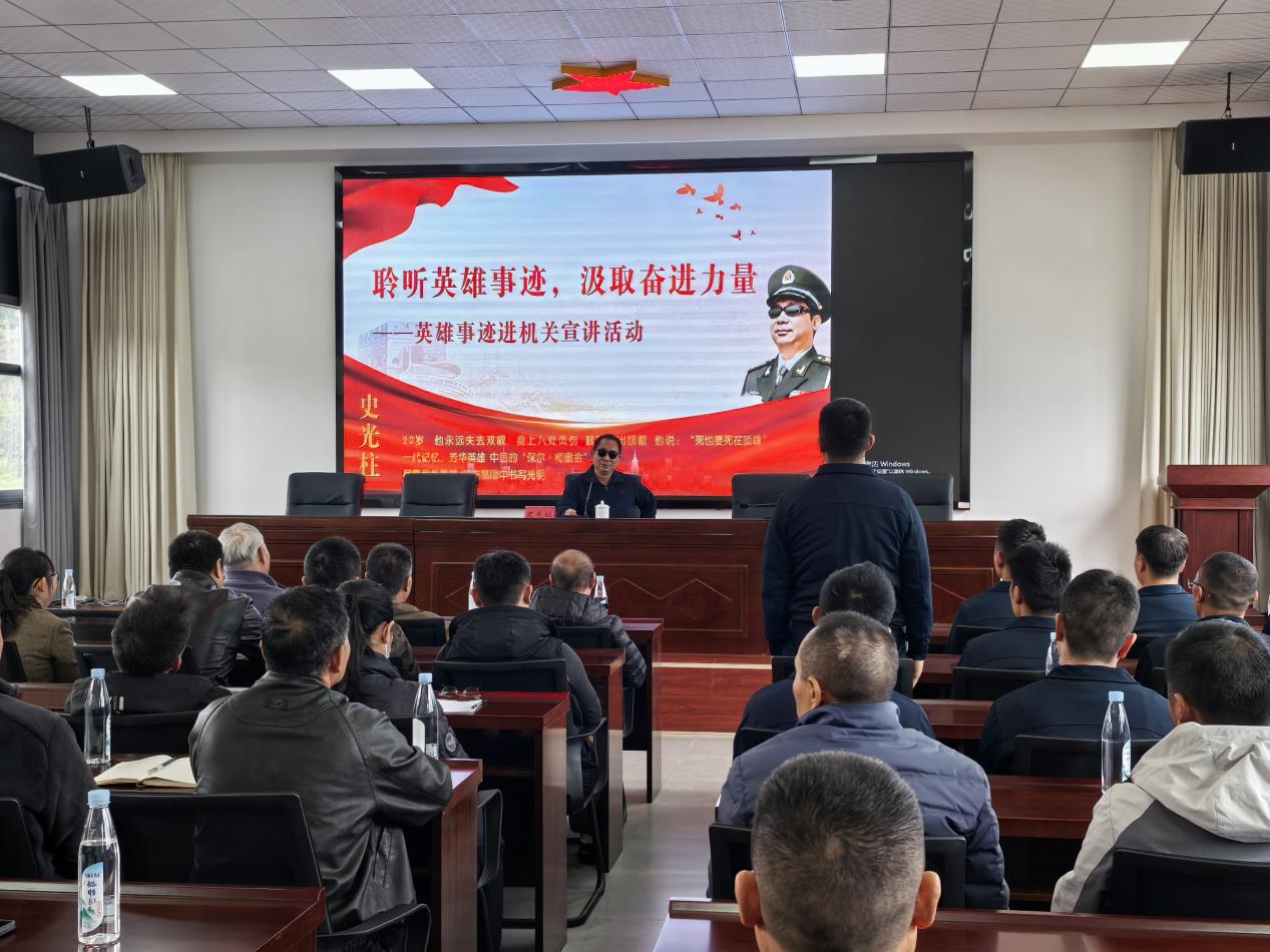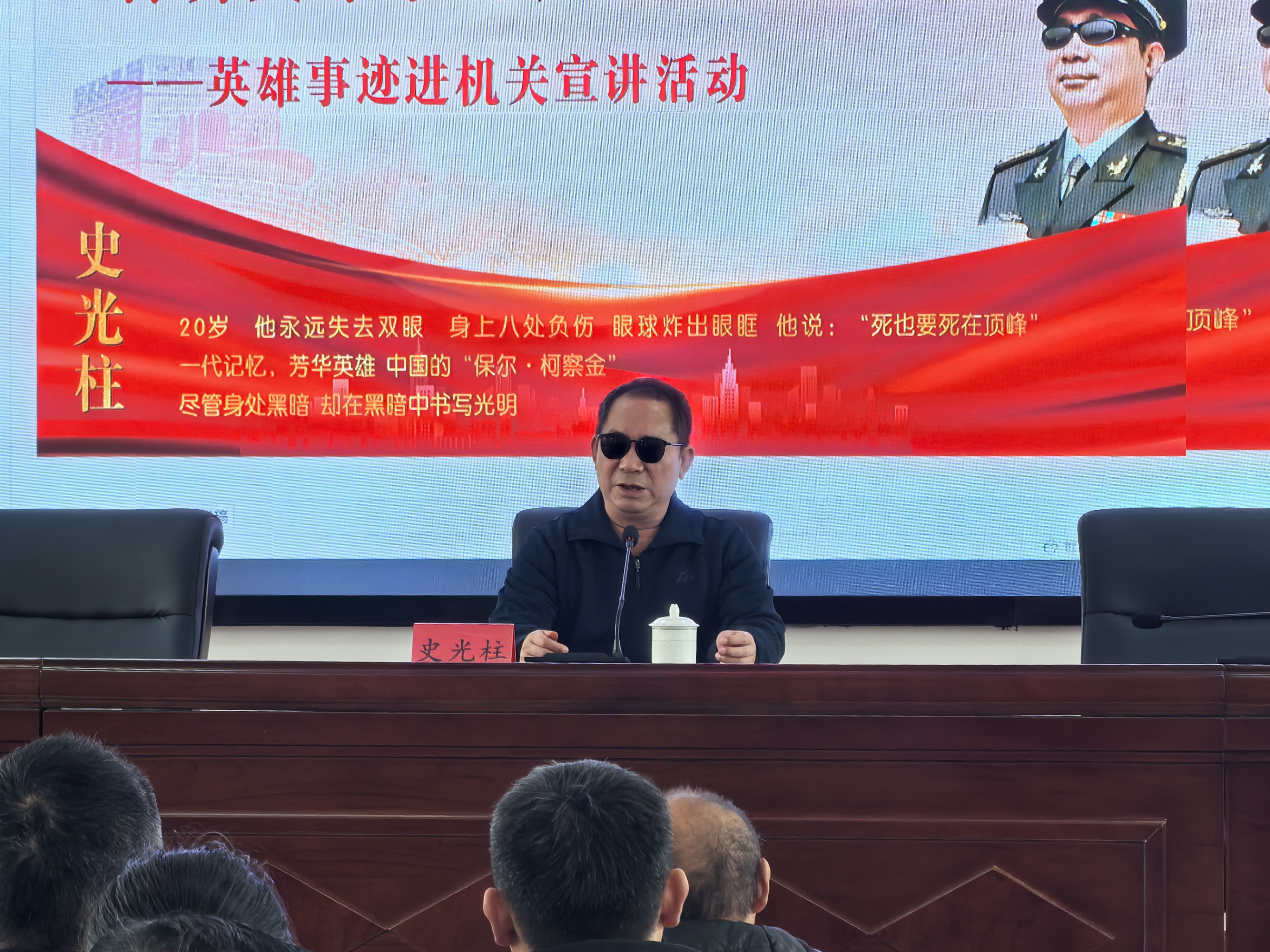 本次宣讲以“弘扬抗战精神 争当时代先锋”为主题,既是退役军人 “返乡第一课”,也是干部职工爱国主义教育课。史光柱追忆杨靖宇、赵一曼等先烈壮举,结合自身边境作战重伤失明仍坚守阵地、伤后笔耕不辍的经历,阐释抗战精神与老山精神的时代内涵,质朴深情的讲述多次赢得现场掌声。