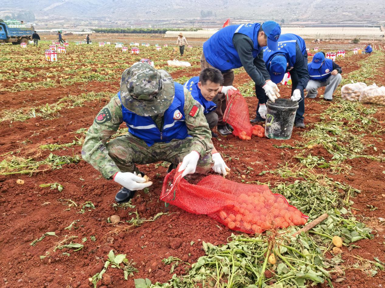 近日,开远市退役军人志愿服务队走进大庄乡宜民社区开展爱心助农志愿服务。退役军人事务局通过前期摸排得知,退役军人杨岳跃长期省外务工,家中两位老人留守,9亩洋芋正值收获期却面临劳动力短缺问题,且其弟弟为现役军人驻守一线无法顾家,雨季临近更恐影响收成,志愿服务队随即制定帮扶方案开展行动。