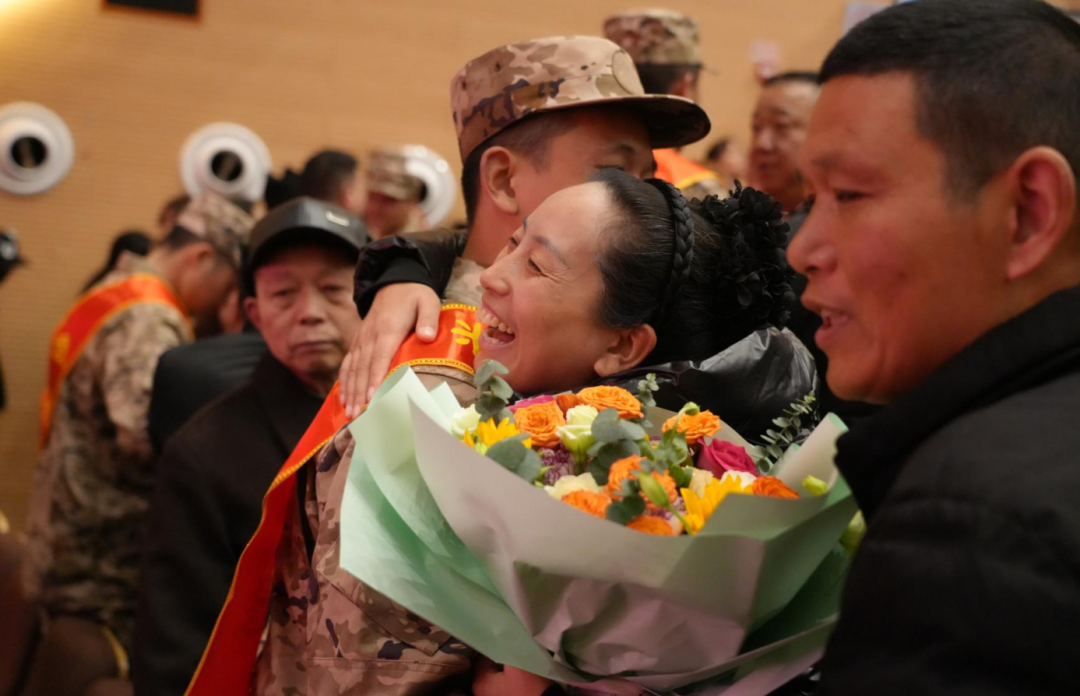 欢送会后,新兵与家人们依依道别。不少家长为孩子整理衣帽、送上鲜花、深情拥抱,全家人合影留念,为即将启程的青年送上最真挚的祝福。新兵家长繁华为孩子带来一束向日葵,“作为父母,心中既有不舍,更有骄傲。孩子参军入伍是家庭的荣耀,希望他未来向阳而生。”
