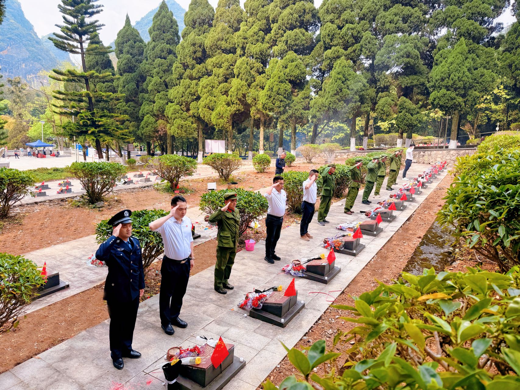 当天,副市长曹阳率队前往靖西、那坡烈士陵园,向江门籍烈士敬献花圈。全体人员行三鞠躬礼,依次献花、瞻仰,表达对英烈的悼念与敬仰。随后,全体党员面向党旗,举起右拳,庄严重温入党誓词。一行人分成四组,擦拭江门籍烈士墓碑,为墓碑描红,并对烈士墓数量、地理分布位置、管护情况进行信息核对与照片采集,为烈士信息精准建档留存了详细资料。最后,大家走进那坡烈士陵园陈列馆,通过历史图片、文物史料与文字记载,沉浸式学习英烈们为国家和民族浴血奋战的光辉事迹,在红色精神洗礼中汲取前行力量。
