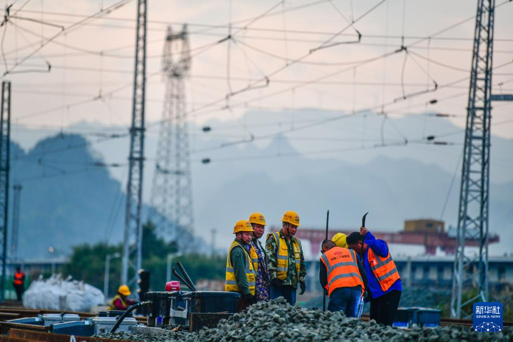 3月30日,工人在贵州瓮马铁路南北延伸线绿荫湖站改造工程现场施工。