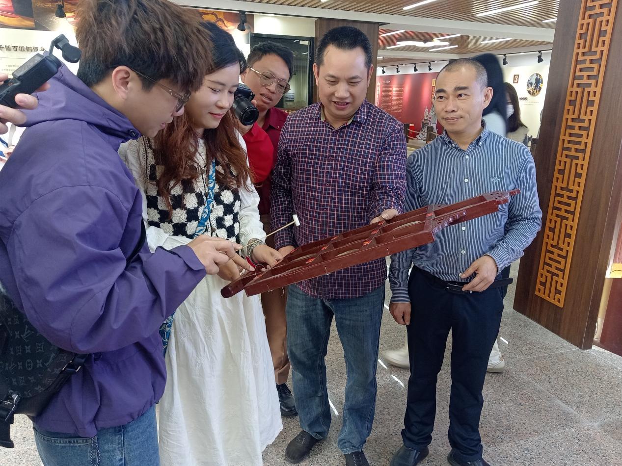 采风之旅首站走进十音铜锣锻制技艺展示馆。作为省级非物质文化遗产,泉州十音铜锣是闽南音乐文化的活态瑰宝。展馆以“保护非遗瑰宝,传承文化薪火”为核心,打破静态展陈的局限,通过实景呈现、匠人实操、互动体验等方式,让传承四百年的技艺变得可触可感。