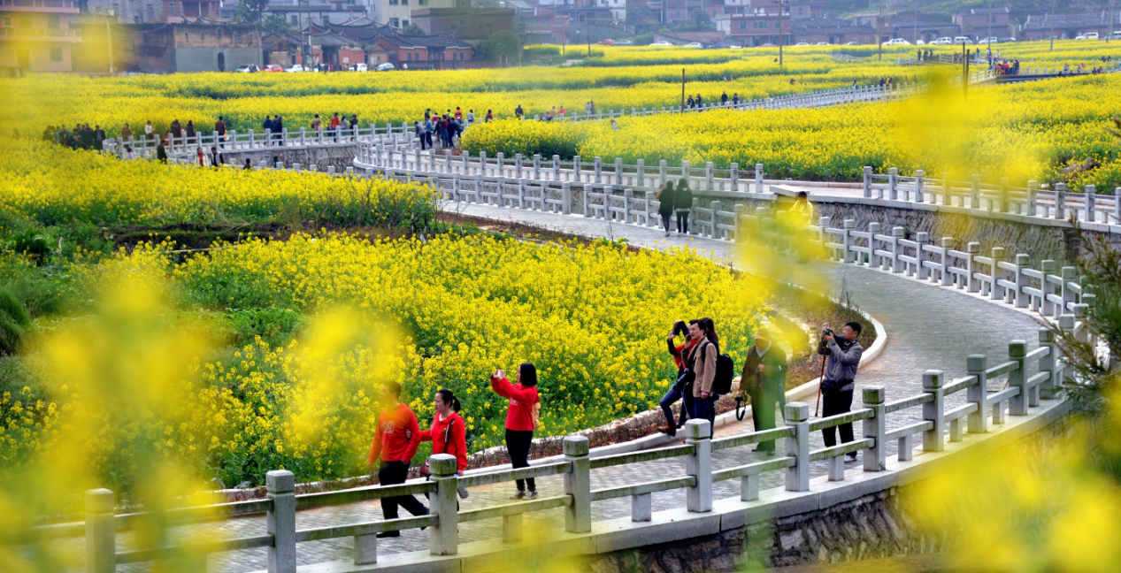 油菜花基地与彭祖长寿养生馆连片成景、相映成趣。作为泉州规模最大的油菜花观赏地,每到花期,金色花浪翻涌不息,吸引了无数游客前来打卡留念。在刚刚圆满闭幕的第十一届花朝节上,虹山乡以花为媒、以节兴旅,串联观光、体验、招商、消费,让小小油菜花,开出乡村振兴的“金色经济”。
