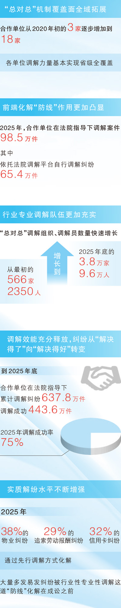 当前,社会矛盾纠纷持续增加,新类型纠纷多发频发,传统的调解机制已难以满足群众日益增长的解纷需求。“‘总对总’多元化纠纷解决机制打通法院与有关单位对接渠道,更有利于法院履行指导调解法定职能,助力行业性专业性调解组织培育,让‘内行人’调处‘专业事’,形成1+1>2的解纷效能,更好满足群众多元解纷需求。”最高人民法院立案庭副庭长李盛烨说,行业专业调解队伍更加充实,“总对总”调解组织、调解员数量快速增长,从最初的566家、2350人增长到2025年底的3.8万家、9.6万人。