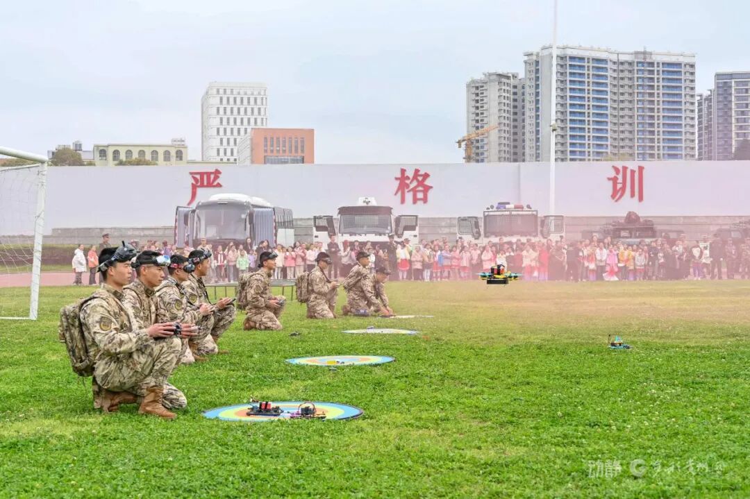 综合训练场上,无人机科目训练精彩呈现。官兵们熟练操控无人机,精准完成定点抛投、快速袭击等任务,烟雾弥漫的现场展现出浓厚的实战氛围,让师生们直观感受了军事科技的强大力量,进一步激发了爱国热情。