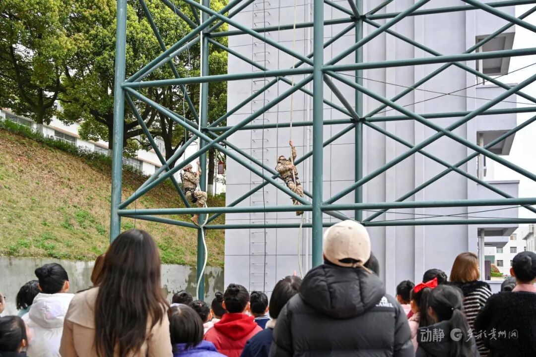 攀登楼前,高空索降、徒手攀登等军事科目演示依次开展。武警官兵身手矫健、动作规范,在高空从容完成各项操作,精准落地、一气呵成,充分展现了过硬的军事技能和顽强的战斗作风,赢得现场师生阵阵掌声。
