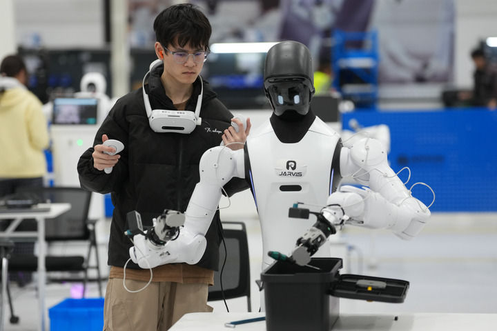 技术人员在宁波博登智能科技有限公司调试人形机器人(3月26日摄)。