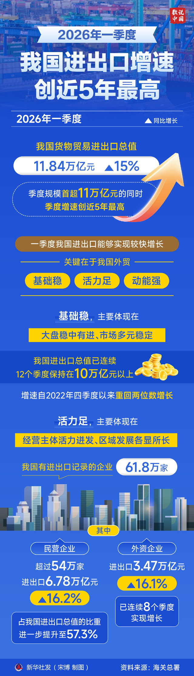 海关总署4月14日发布数据显示,2026年一季度我国货物贸易进出口总值11.84万亿元,同比增长15%,季度规模首超11万亿元的同时,季度增速创近5年最高。
