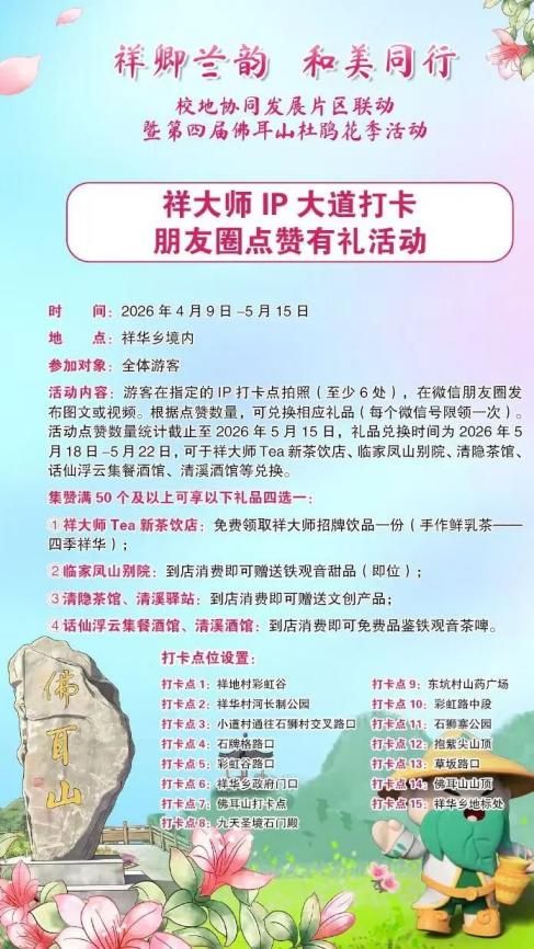 更有打卡点赞有礼环节,游客可在祥华乡境内15个“祥大师IP”打卡点拍照集赞。集满50个赞即可兑换祥大师招牌饮品、铁观音甜品、文创产品或茶啤等好礼。快来打卡祥大师IP大道,赢取属于你的春日礼物!